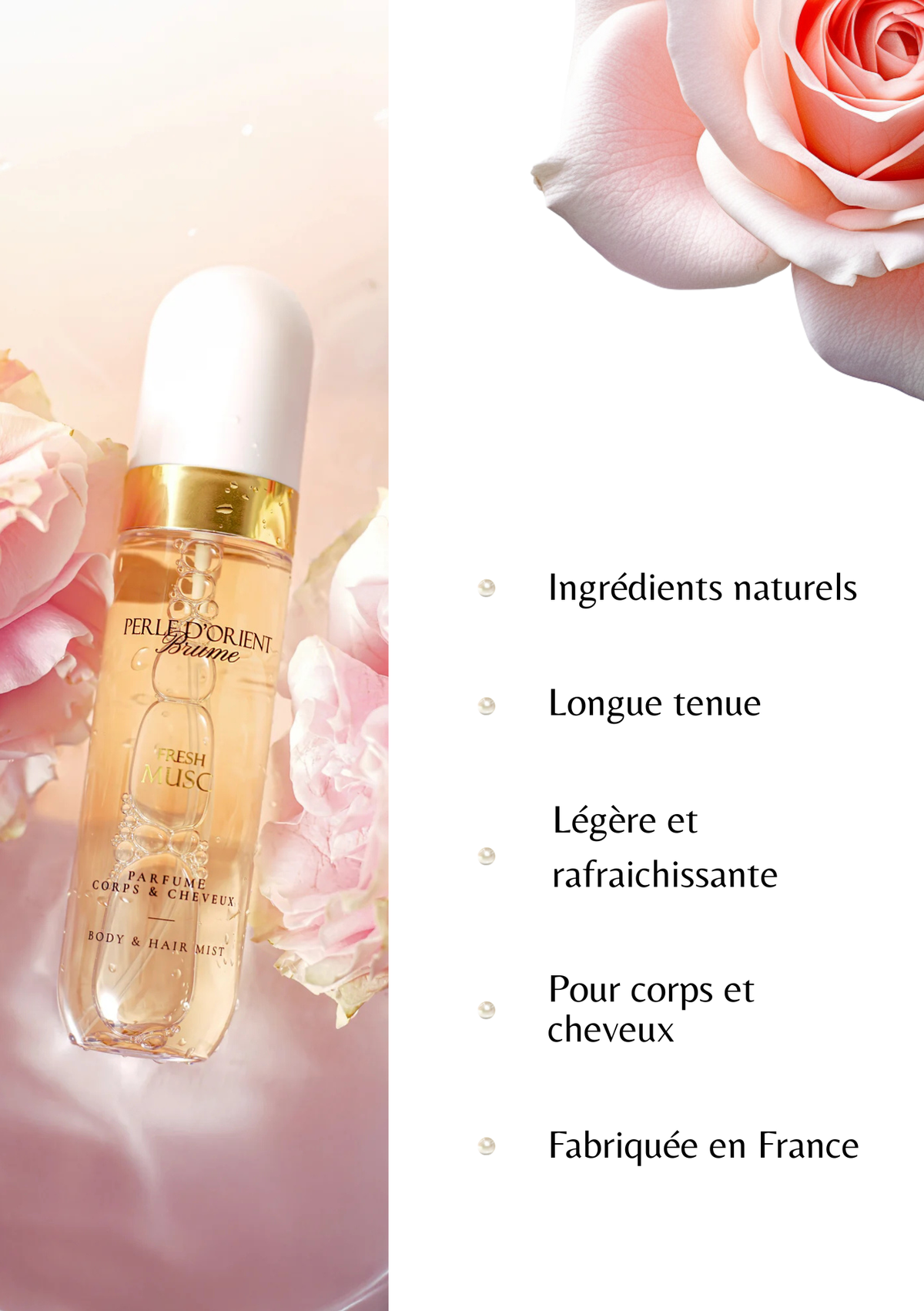 La brume corps et cheveux Perle d’Orient combine une fragrance élégante à base de musc blanc, de fleurs orientales et de vanille, avec une texture légère et non collante, parfaite pour un usage quotidien.