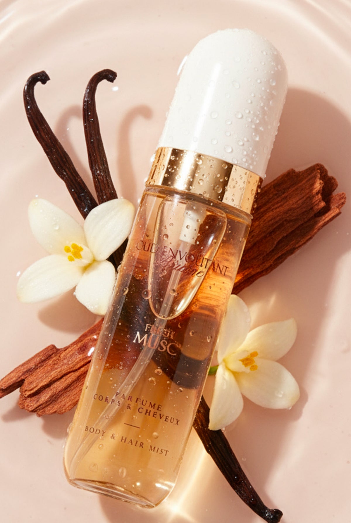 Légère, aérienne et hydratante, cette brume parfumée réveille la peau dès le matin. À vaporiser sur le corps ou les cheveux, elle laisse un sillage discret mais raffiné, parfait pour les instants de fraîcheur ou les retouches parfumées dans la journée. Le duo musc‑oud y est adouci pour un effet cocon.